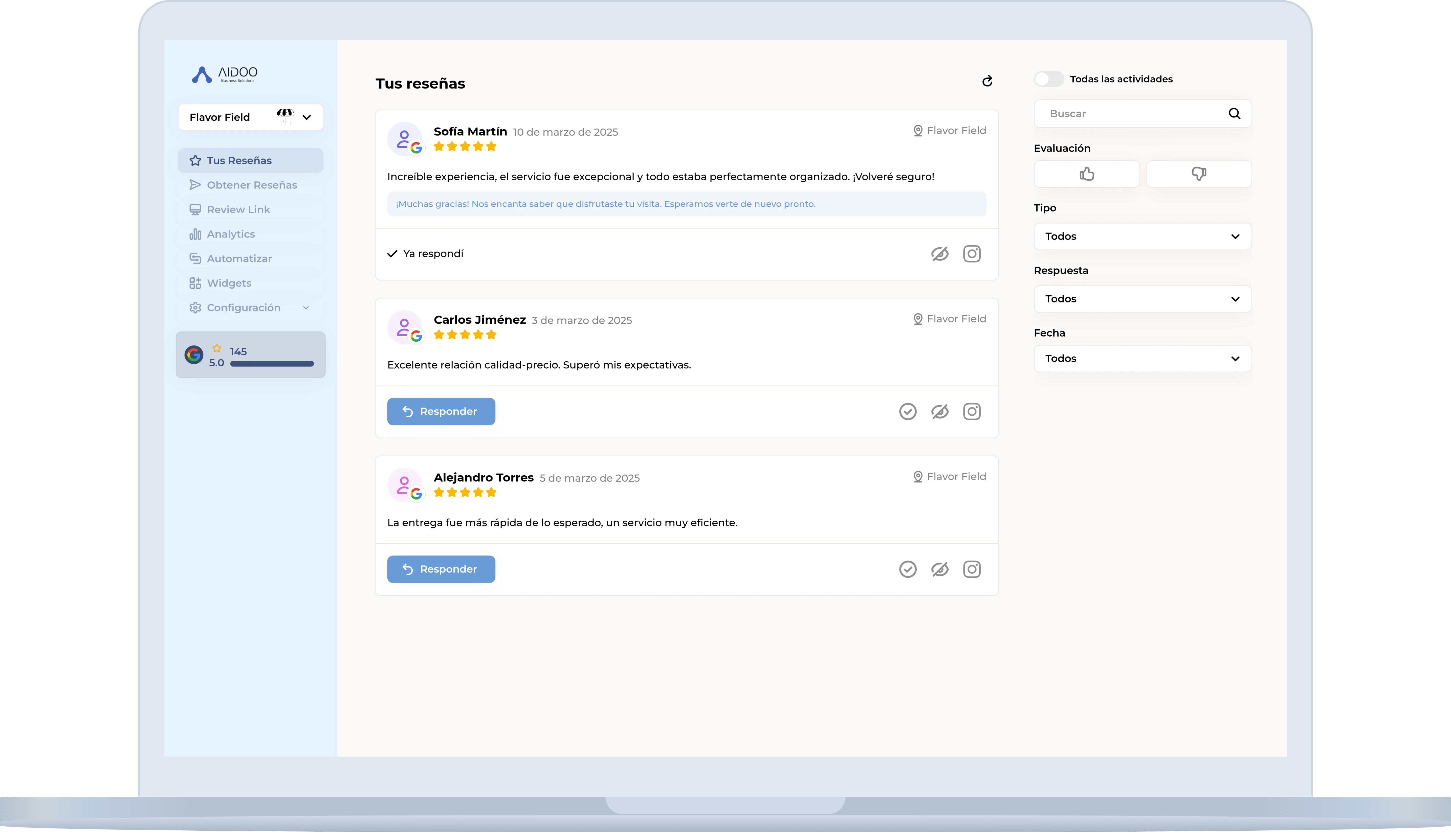 Cuando las personas buscan empresas en Facebook, encontrarán y elegirán la que tenga las mejores reseñas y, con Aidoo Reviews, esa será su empresa.