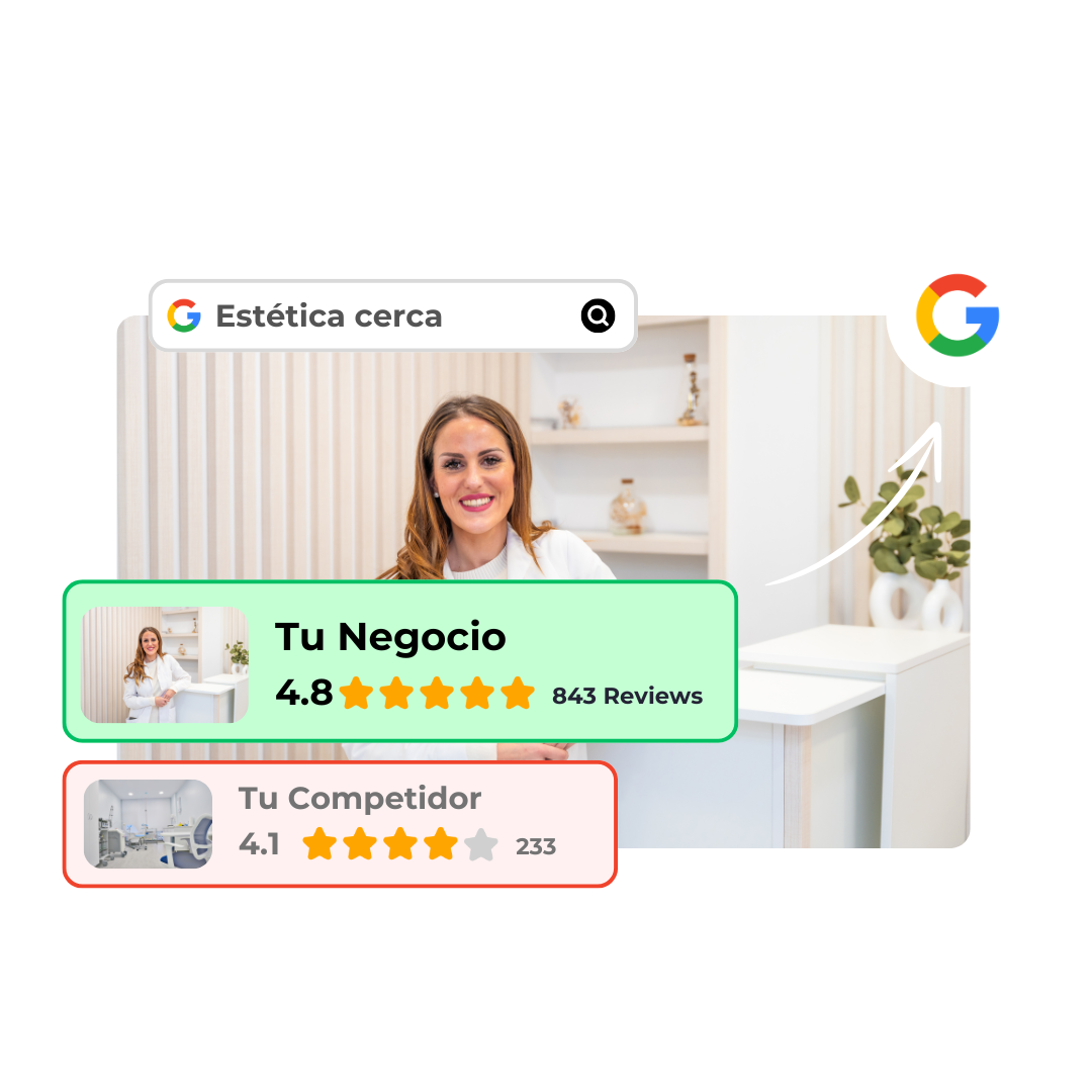 Con más reseñas de 5 estrellas, tu negocio aparecerá en la primera página de Google cuando los clientes potenciales busquen negocios en tu zona. Al convertirte en la opción más obvia, captarás nuevos clientes potenciales más rápido gracias a tu excelente reputación.